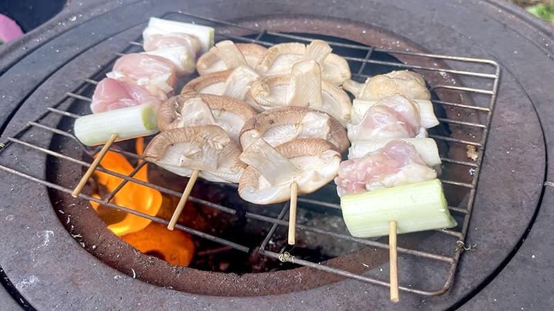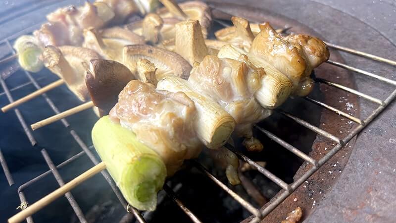 焚き火の熾火で焼く焼き鳥は、素人調理でもなかなかにうまい。