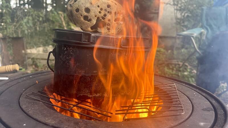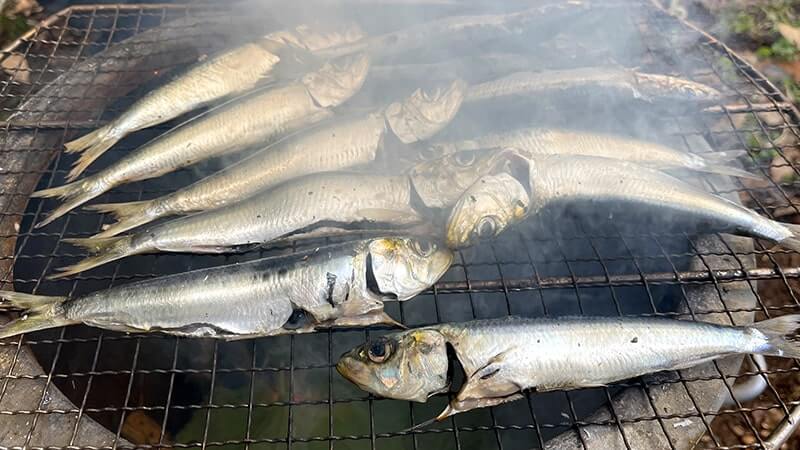 さて、マイワシを燻しつつ、我々の朝食作り。